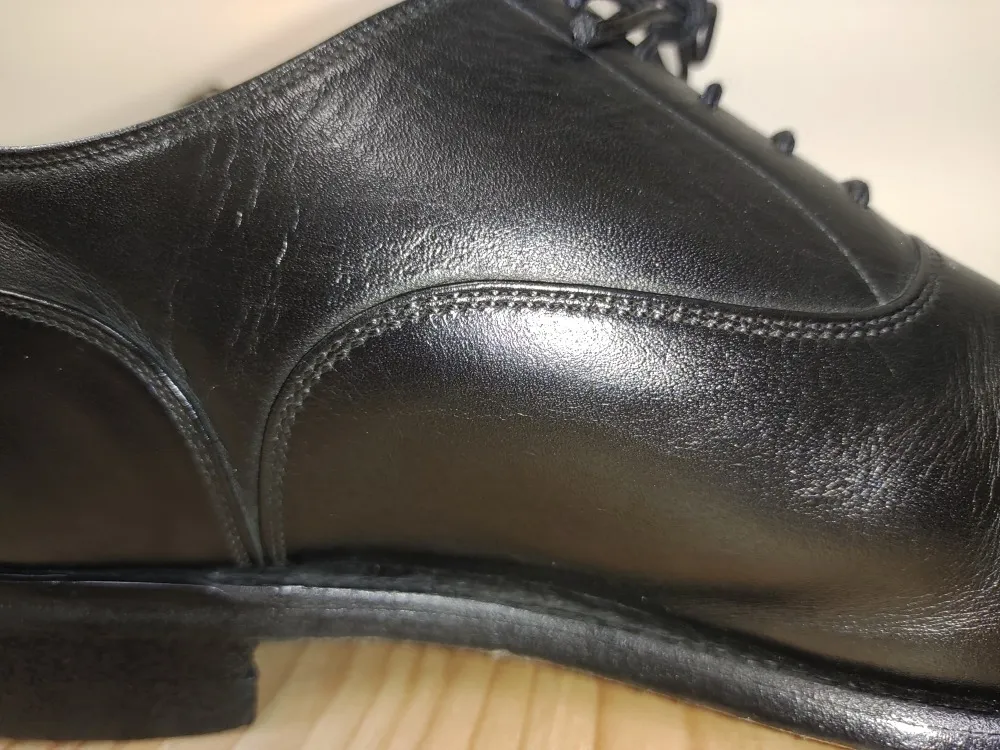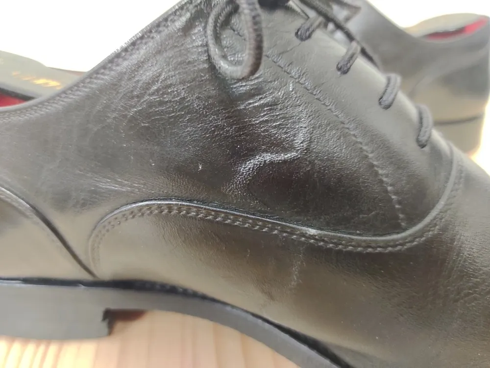 毎日この1足を履き続けていたら、2枚目の画像のように塩吹きになってしまったようです。汗を吸った革の表面に汗塩が出た状態です。そしてお客様自身で直そうしたところ、3枚目の画像のように銀浮きになってしまったそうです。革の銀面と呼ばれる表面の層がボコボコした状態ですね。
