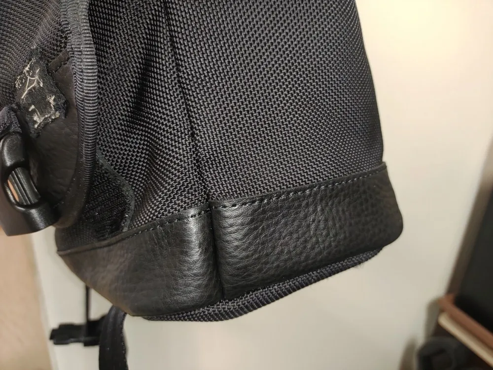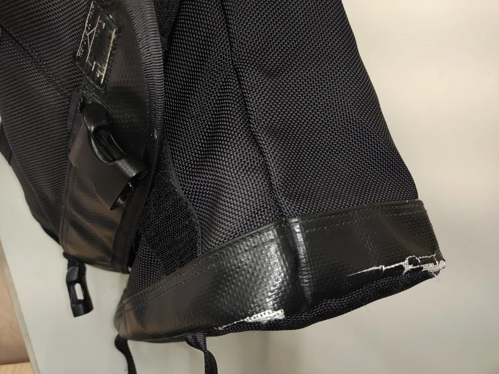 今回はそんなファスナーの修理ではなく、底部分をぐるっと一周しいている生地の修理です。2枚目の画像のように、黒い塗装が剥がれて下地の白い布地がむき出しになっています。
