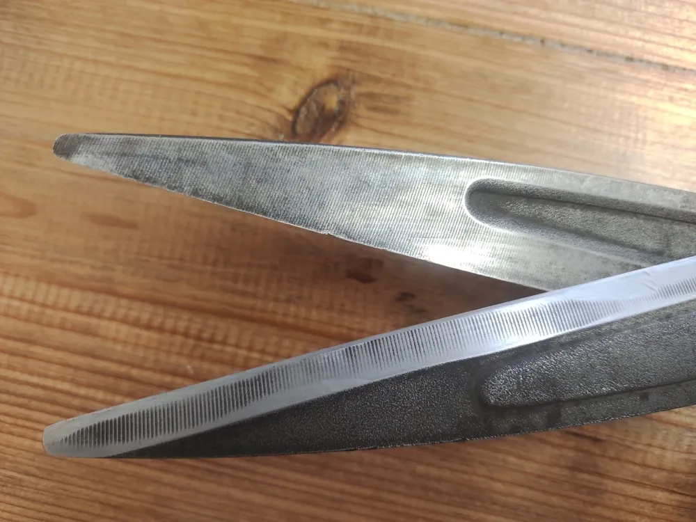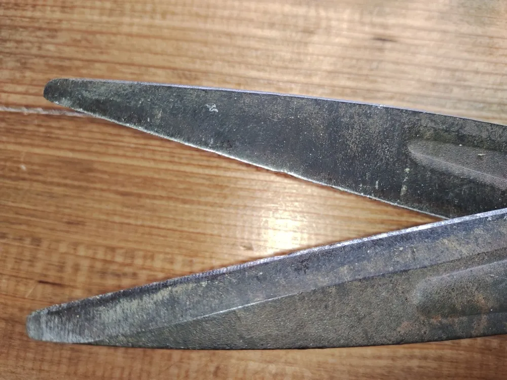 刈込鋏というのか枝切り鋏というのか知りませんがそういう鋏です。硬い枝も切るため、刃先がすっかり丸くなっています。中央あたりは刃が欠けています。一般的に刈込鋏を研ぐイメージがないかもしれませんが研げます。