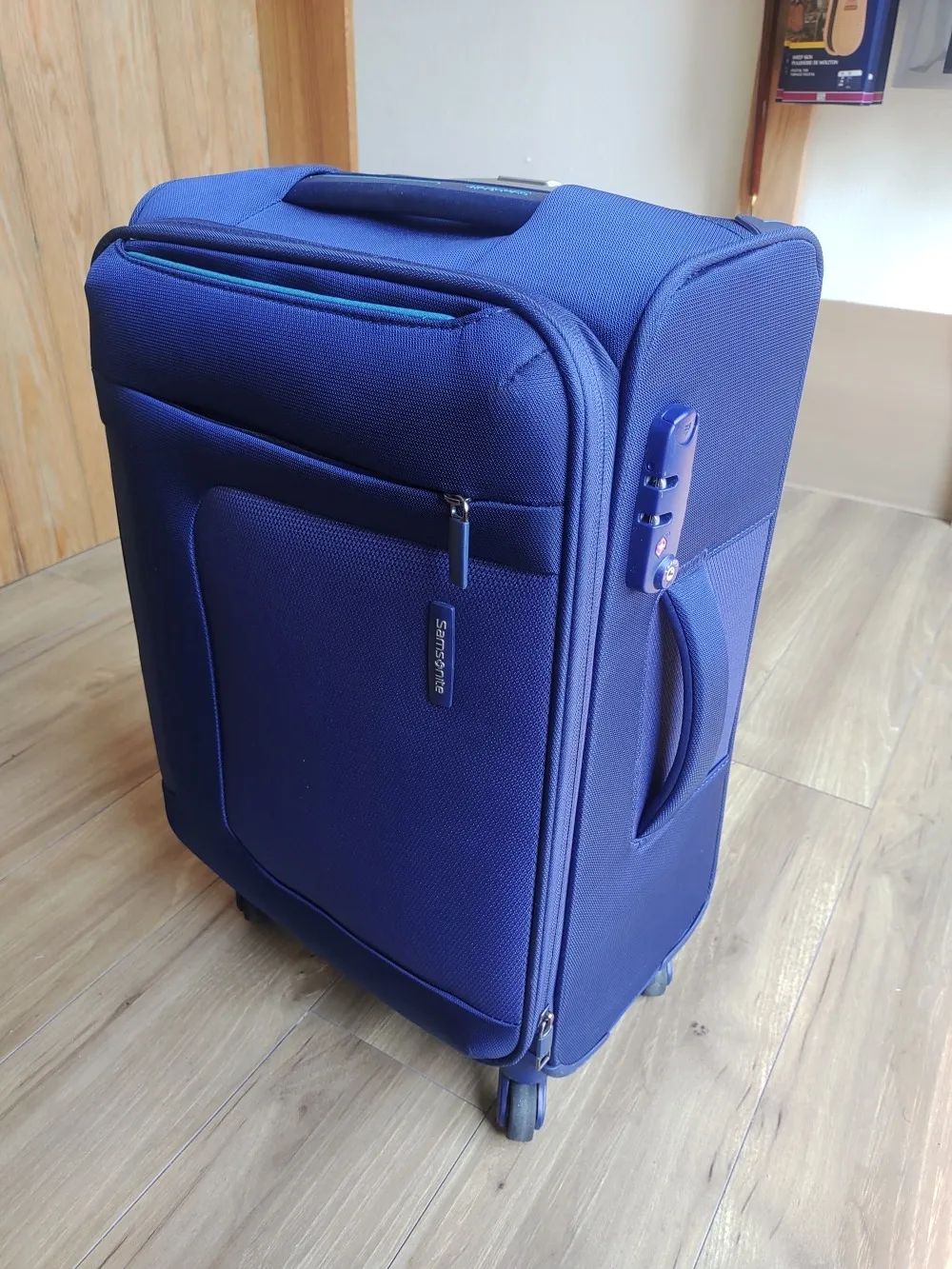 サムソナイト(Samsonite)のスーツケースです。ちょっと珍しい布地のソフトタイプですね。この伸びた伸縮ハンドルが縮まなくなってしまいました。旅行中は伸びなくなると移動するときに困りますが、逆に伸びたままだと使わないときに邪魔になるので困ります。どちらにしろ結局困ります。なので、いつものごとく直します。