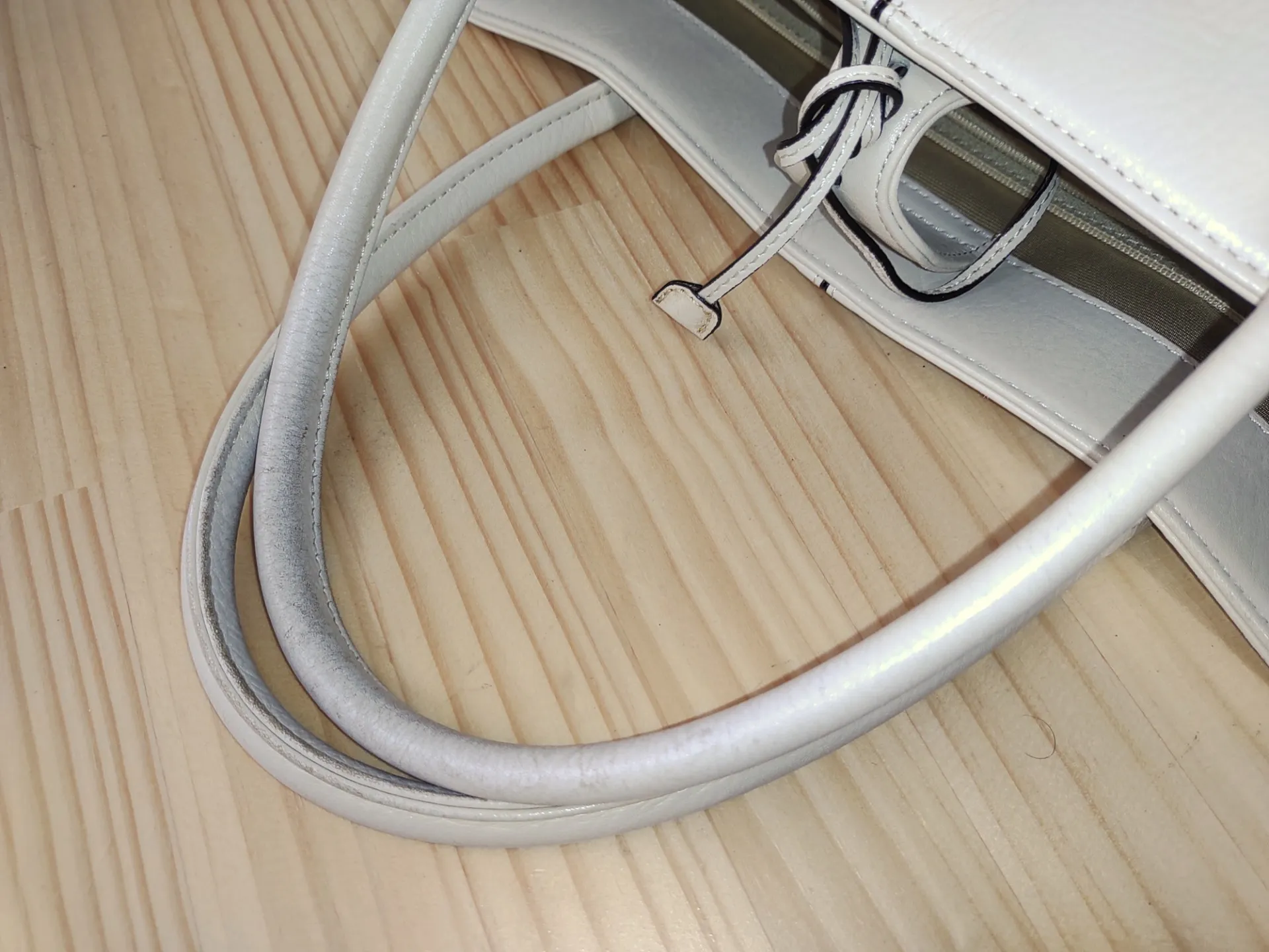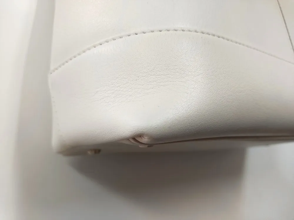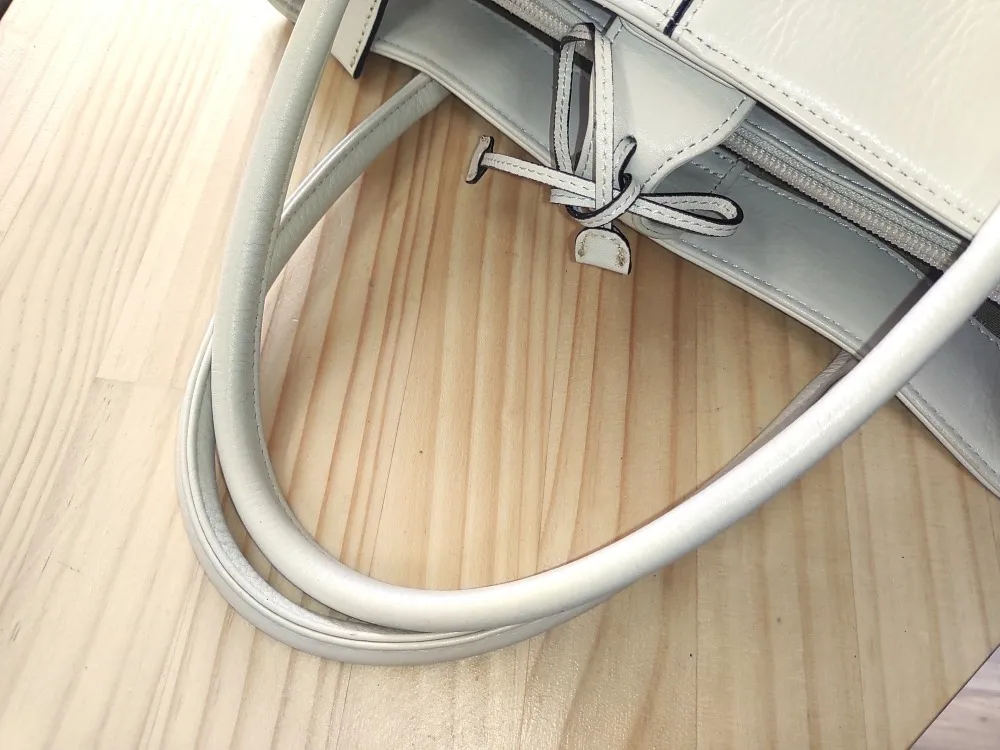 上3つの画像の白いカバンですが、目立った汚れもない奇麗な状態です。ところが、色ハゲが角の部分や持ち手を中心に見られます。普段使いする以上、避けられない悩みかと思います。そんなカバンをカラーリングによって色ハゲを修繕します。