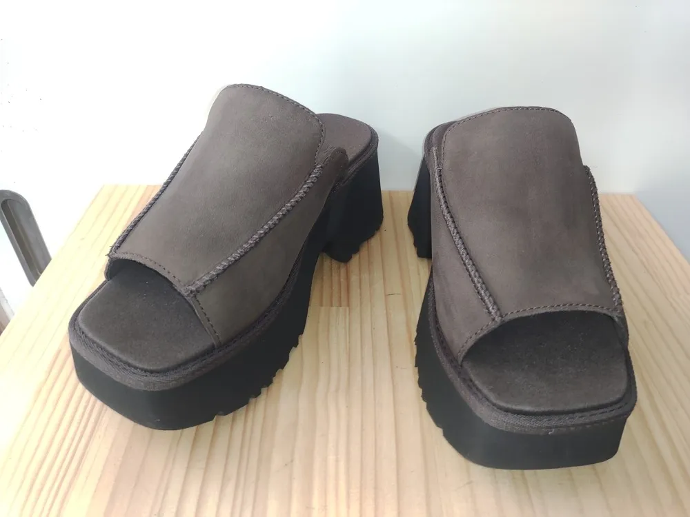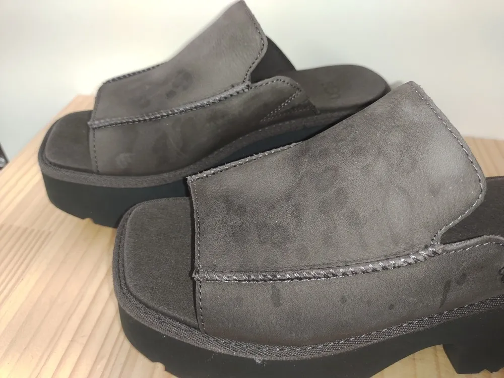 UGG(アグ)の厚底サンダルに芳香剤をこぼしてしまいシミができたそうです。見事に両足に直撃してますね。柔らかいスエードの革なので、どれくらい色抜けしてしまっているかがポイントになってきます。UGGといえば羊のイメージですが、これに関しては以前よく見かけたブーツのスエードではなく、牛さんのスエードかもしれません。UGGらしい謎の肌触りをどれくらい維持できるか心配しつつ作業をします。