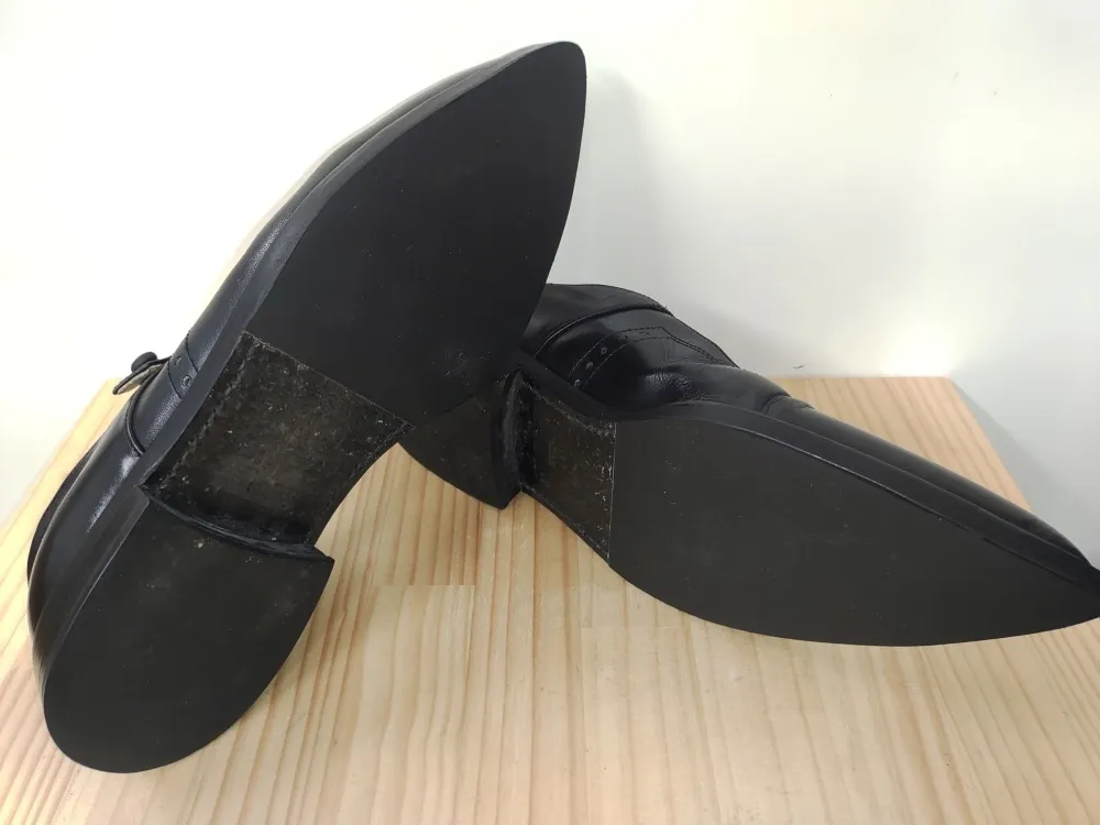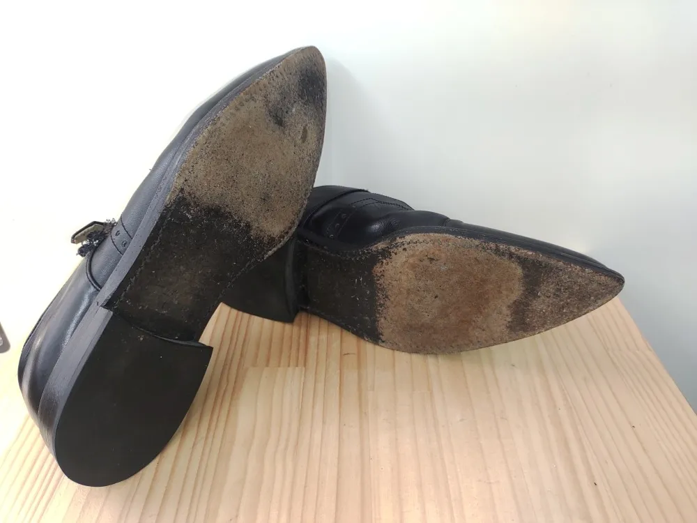 つま先の削れ防止とスベリ防止としてハーフソールを貼りました。分かりづらいですが、削れ過ぎたつま先を回復してからハーフソールを貼っています。そして、ボタンのゴムですが、あれだけびろーんと飛び出ていても、修理してしまえば5mm程度しか飛び出ていません。この少しだけ伸びるゴムが履きやすさを左右します。