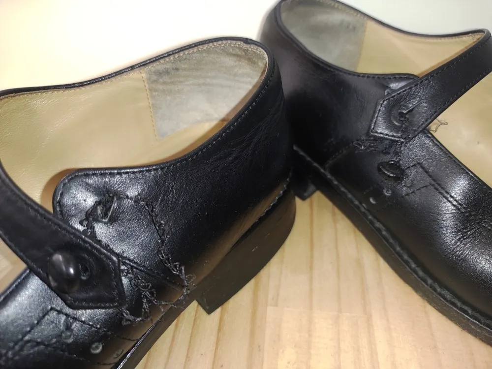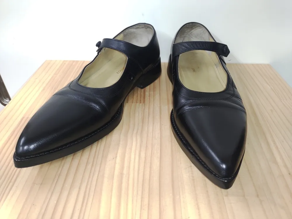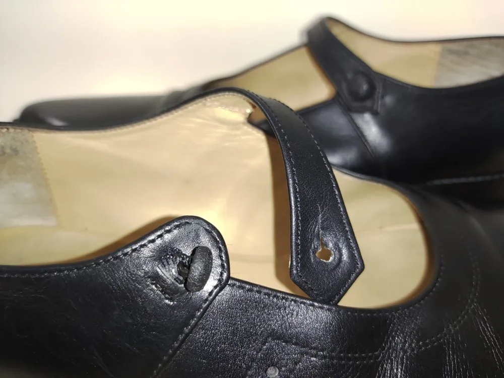 ポインテッドトゥと呼ばれる先の尖ったパンプスです。シュッとしてスタイリッシュに見えるが特徴ですね。脱げにくくなるようベルトが付いたタイプです。そんなポインテッドタイプの欠点といえば、つま先が削れやすいことです。実際の指先よりかなり前の位置に靴のつま先があるため、通常のラウンドトゥよりも削れやすくなります。そしてベルトを留めているボタンのゴムが劣化で全く原型をなくしています。