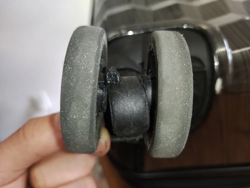 スーツケースがまっすぐ転がらないということでご来店いただきました。パッと見たかんじだと何も問題ないように見えます。しかし、2枚目の画像のように車軸がグラついて斜めになります。軸受のプラスチックが溶けて、イボみたいに飛び出していることが確認できます。通常であれば車輪のみの交換で済むのですが、軸受に問題があるので、今回は土台からの交換になります。