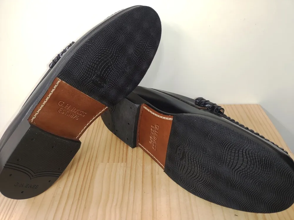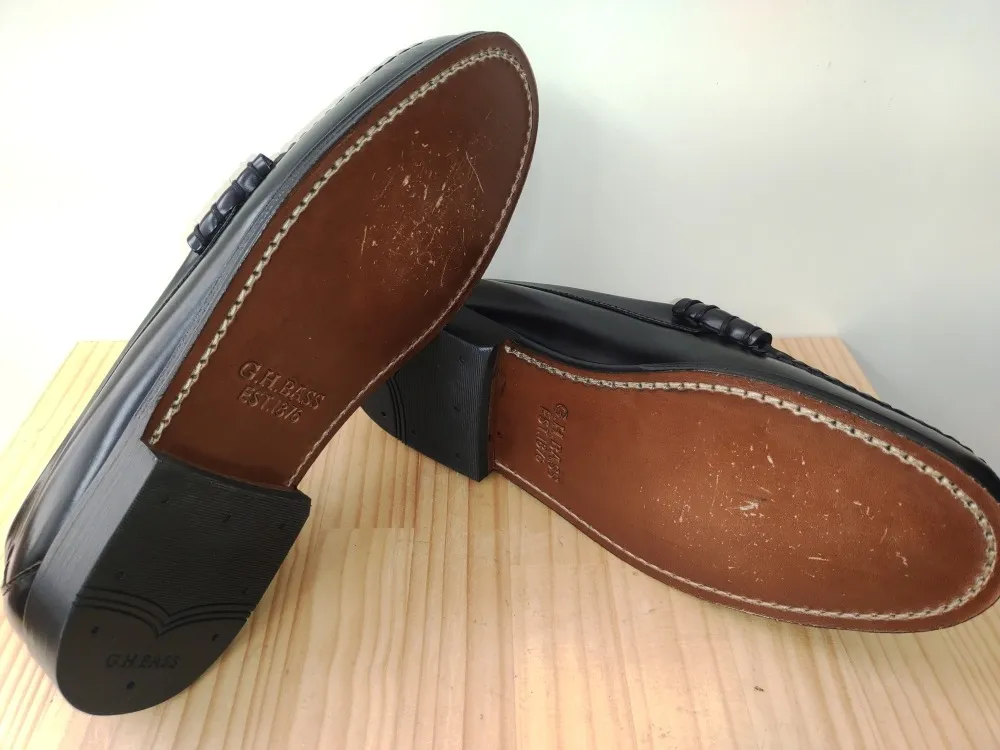 白と黒のコントラストが印象的なG.H.BASS(ジーエイチバス)のローファーです。新品です。ハーフソールを貼りたいということでご来店頂きました。