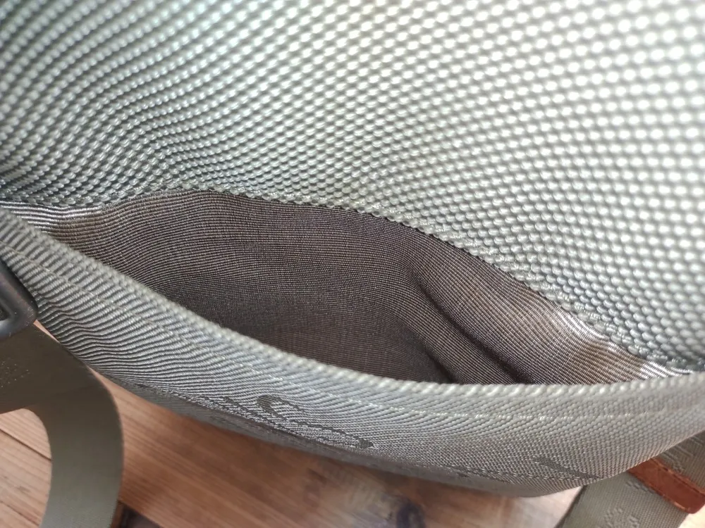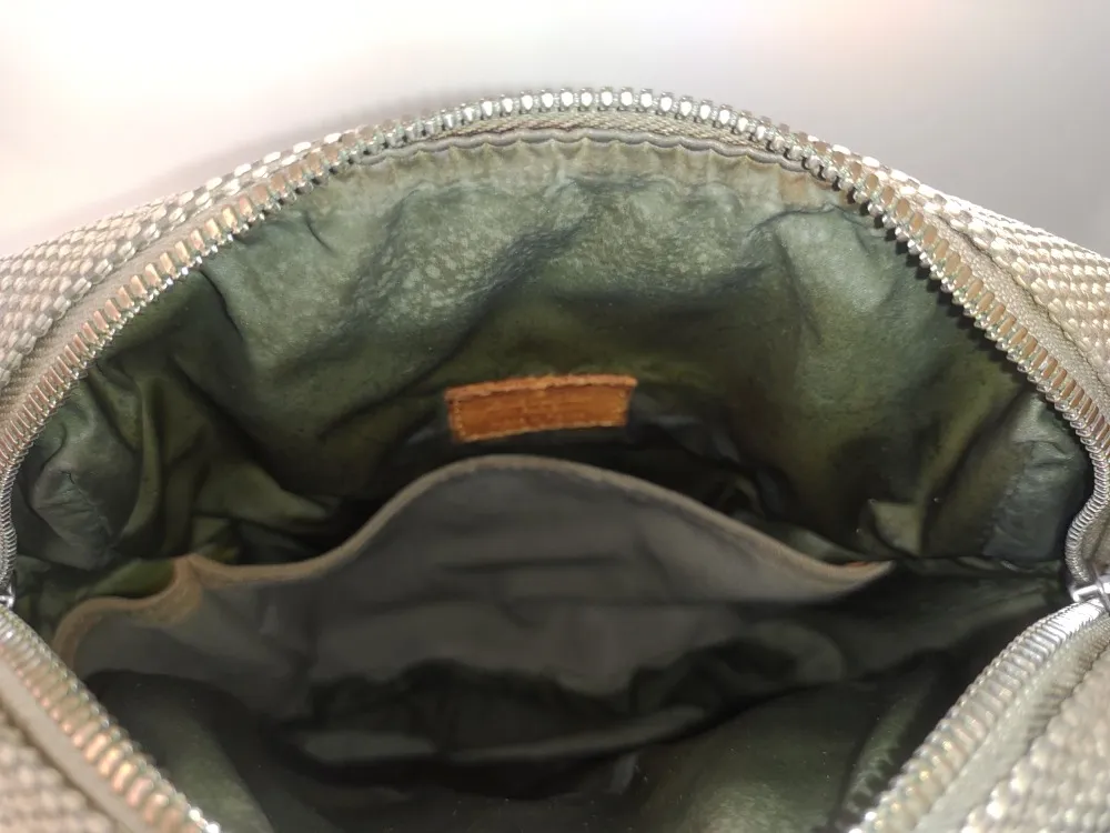 内装は定番のシャンタン生地で交換です。合皮の内装の劣化はよく見かけますが、このカバンは珍しく中のクッション材の劣化でベタついてました。最後の画像のように外ポケットの内装も交換しています。