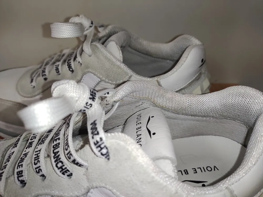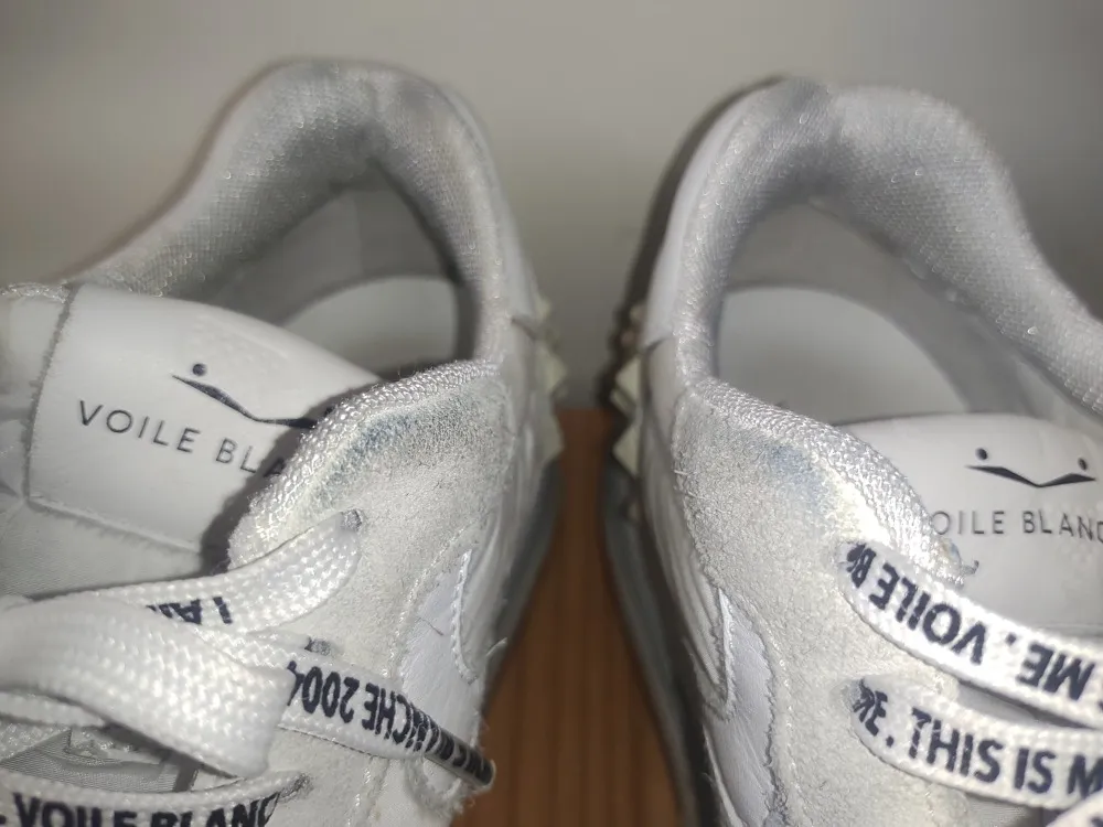 VOILE BLANCHE (ボイルブランシェ)の白いスニーカーです。白いスニーカーといえば、当ブログでも何度も登場しているクリーニング。汚れが目立つにもかかわらず、白が人気みたいですね。そして今回は、ジーパンの青い色がついてしまったので、それをキレイにしたいとお持ち頂きました。デニム生地は通常施される色止め処理をしてないものが多いので、こういう色移りが起きやすいです。ちなみに、靴だけでなくバッグでもよく起こるので注意してください。